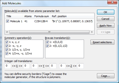 The Add Molecules command is available in the Molecules sub-menu of the Build menu and opens the Add Molecules dialog, which looks and behaves similar to the Add Atoms dialog that creates selected atoms of the parameter list directly at "x,y,z" or at symmetry-equivalent positions. Here you have a list of the molecular units rather than the list of atom sites.
