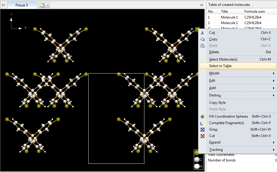 To create the picture in the following screenshot, we mark all symmetry operations and Bravais translations of space group Aba2 (no. 41), so we should get eight molecules. In this compound this is rather straightforward, since all atoms in the parameter list are on the general site 8b, except the spiro atom "C1" on 4a (0, 0, z). The data pane shows the table of created molecules (cf. "View"/"Table"/"Created Molecules"), to get to know what molecule comes from what symmetry operation. To select the molecule row in the table, click on an atom of a molecule in the structure picture and choose "Select in Table" from the context menu.
