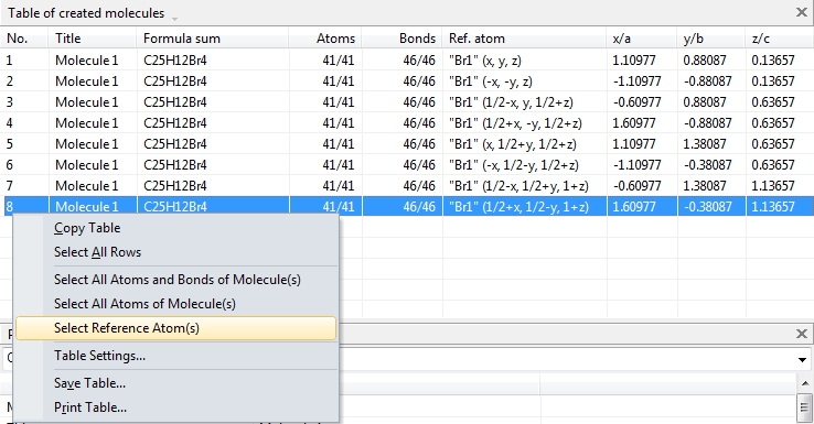 This also works the way back. Select a row in the table of created molecules and choose the command "Select Reference Atom". The two neighbouring commands "Select All Atoms of Molecule" and "Select All Atoms and Bonds of Molecule" select all atoms (and bonds, rsp.) of the molecule that is highlighted in the table of created molecules. (This also works for multiple highlighted rows and selects multiple molecules.)