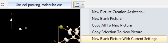 Previous article: Completing molecular fragments Add Molecules dialogTo prepare the next structure picture we start from sample "COD-1501635-unit-cell-packings.diamdoc", which has already four pictures of packings, and create a fifth picture ("Picture 5") as blank picture with current settings (that means the same atom designs, viewing direction, etc.). You may call the "New Picture" command from the "Picture" menu and walk through the "New Structure Picture Assistant", but it is easier to click on the main toolbar's button New Blank Picture or to use the accelerator key Alt+Ctrl+N: If you are using tabs, you can also click on the dropdown button right beneath the "Create new tab" pseudo-tab and choose the command "New Blank Picture With Current Settings" from the dropdown menu: