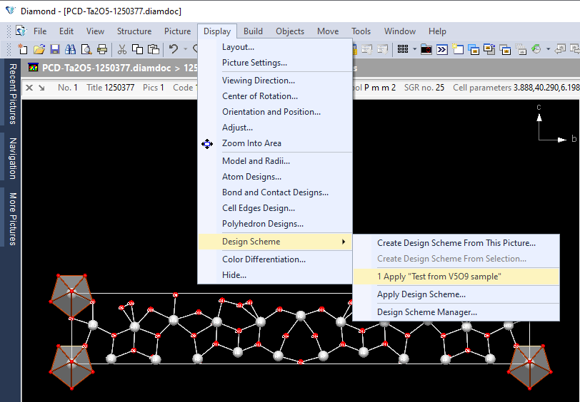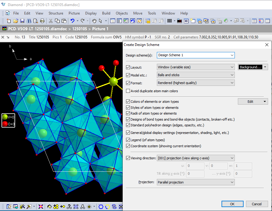 Definition of a design scheme You find the commands that deal with design schemes in the corresponding submenu of the Display menu. The first command Create Design Scheme From Picture... initializes a design scheme from the current picture settings -- from layout, model, rendering or not, across the atom, bond etc. designs up to the viewing direction. Use the checkboxes to decide what the new design scheme may change when applied later. For instance, you can create a design scheme that only reflects the atom (type) designs. So you can easily change current atoms' designs to have different colors, ellipsoid styles, etc. The second command Create Design Scheme From Selection... (introduced in version 5.1) does not access the global picture settings but the designs of the atoms that are currently marked as selected as well as the designs of the selected bonds, contacts, and H-bonds and the designs (of faces and edges) of the currently selected polyhedra. This is well suited to create design schemes for special building units, e.g. inorganic units with complex polyhedra or molecular fragments. We show the definition and application of design schemes in the following scenarios. Scenarios #1 through #3 work with global picture settings, while scenario #4 demonstrates how to define a design scheme from the atoms and bonds of a selected molecular fragment that can be used as organic linker in Metal Organic Frameworks (MOF). Scenario 1: Defining a design scheme and applying to another structureThe following screenshot shows the Design Scheme dialog. Open the sample file "PCD-V5O9-LT-1250105.diamdoc", which contains one picture with a unit cell viewed along c-axis and with semi-transparent coordination polyhedra around all V atoms.