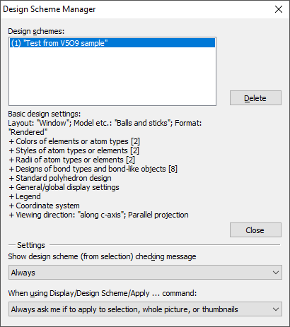Design Scheme Manager The Settings in the lower part of the dialog define, if and how far you will be prompted, if there are ambiguities when creating a design scheme from selected atoms etc. and where to apply a design scheme, if there are currently selected objects in the structure picture.