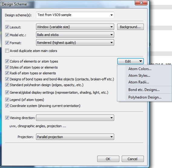 These are: The fourth section is for viewing direction and projection, and has already been available in "Picture Creation Assistant" since Diamond version 3. Before we save this design scheme as new design scheme with the title "Test from V5O9 sample" in the Windows Registry, we will point you to some additional possibilities to make changes - for instance in atom, bond, and polyhedron designs. Push the Edit menu button (in the Design Scheme dialog), which opens a menu with commands to edit atoms' (better: the atom types' or elements') colors, styles, and/or radii as well as properties of bonds and bond-like objects and polyhedra. Note: Some screenshots in this article have been made with version 4 of Diamond.