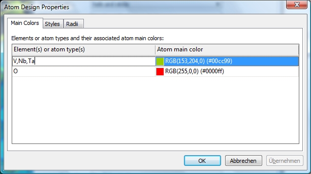 Commands Atom Colors..., Atom Styles..., and Atom Radii... open the Atom Design Properties dialog, which begins with two rows, one for "V+0" and one for "O+0". If you want not only V but e.g. also Nb and Ta to become lime green when assigning the design scheme "Test from V5O9 sample", you can edit the element (or atom type) in the corresponding table cell. The same works for atom types' (or elements') styles and radii on the other two pages Styles and Radii, rsp. (here not depicted).