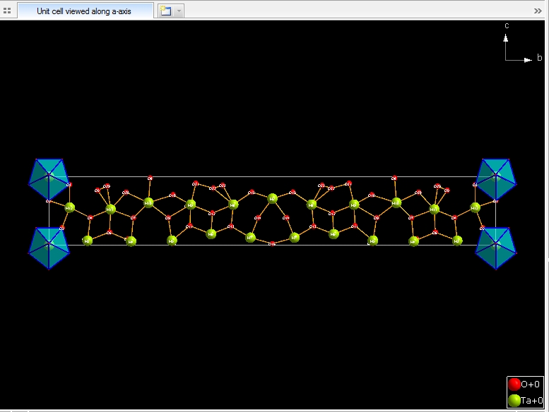 The Ta atoms and the bonds are light gray (color delivered from Diamond export from Pearson's Crystal Data) and turn -- after application of the design scheme -- into lime green (Ta) and yellow (bonds), rsp. (To change the coordination polyhedra, we have to call Display -> Polyhedron Designs..., ensure that the Update existing polyhedra checkmark is set and confirm with OK.)