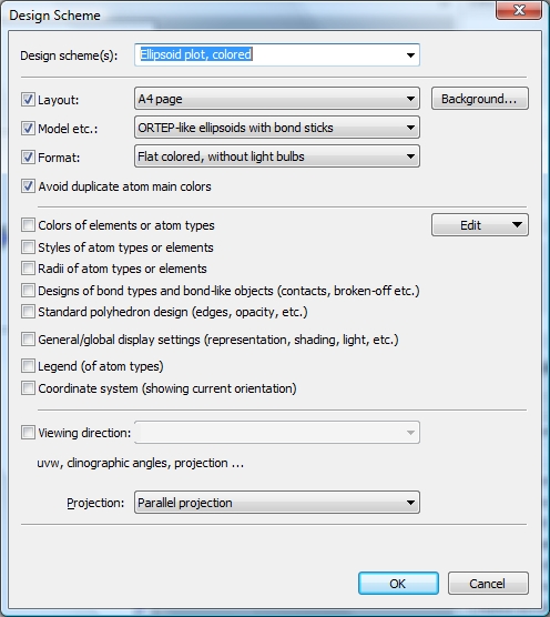 The default or current setting is "window layout", "ball-and-stick model" and "rendered". We run the command Display -> Design Schemes -> Create Design Scheme... and make the following settings in order to get a design scheme for an A4 printout page, thermal ellipsoids, and flat color line representation: