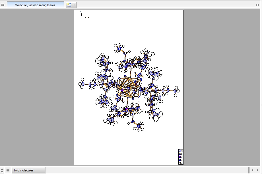 We call this design scheme "Ellipsoid plot, colored". Ensure that the checkmarks are set in Layout, Model etc., Format and Avoid duplicate atom main colors and the other checkmarks are cleared. Then store this design scheme with OK. Application of a design scheme that has been created previously titled "Ellipsoid plot, colored" will now be applied to the structure picture "Molecule, viewed along b-axis" resulting in this page layout with white background and black outlined bonds and atoms in ellipsoid representation: