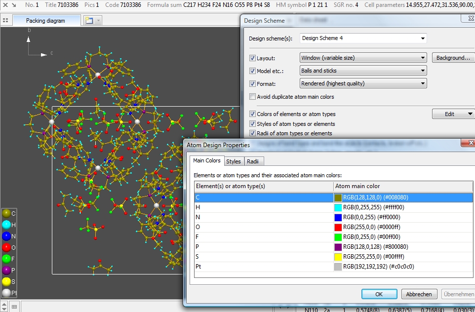 When using the "Auto Picture Creator", the simplest way is to choose the design scheme from the "Scheme" combobox in the "Picture design" section of the Auto Picture Creator. Other ways -- if you prefer manual changes at your structure picture -- is to choose the appropriate design scheme from the Design Schemes sub-menu in the Display menu. When running Apply Design Scheme from a Design Scheme dialog, you have additional choices which fields of the scheme to apply, e.g. just the atom and bond desings but leaving rendering options and background color settings unchanged. Scenario 3: Using design schemes to create atom color, style and radii resourcesThe most convenient way to create a design scheme is from an existing structure picture. The scenario 3 part of the article shows you how to derive a set of resources for atom main colors, atom styles, and radii. Since there are a lot of settings that affect the appearance of a structure picture, such as layout, background color, rendered or flat, enlargement factor etc., the easiest way to create a design scheme is to build a structure picture, and then to call the Create Design Scheme command from the Design Schemes sub-menu in the Display menu. The disadvantage is that you have just a small subset of different elements or atom types in your structure. If you take the design scheme created from that structure and apply it to another structure but with different elements, these other elements' colors (and styles and radii) would not be affected by the design scheme. The screen shot below (sample "COD-7103386.diamdoc") shows the design scheme settings dialog and the set of atom main colors generated from that structure - here just Pt, S, P, N, O, F, C, and H.