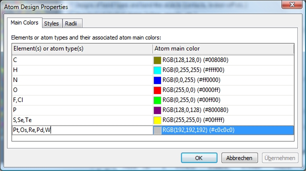 To extend the definition of atom main colors, atom styles, and radii for ball and space-filling representation to other elements than just Pt, S, P, N, O, F, C, and H,, run Edit in the Design Scheme dialog. Enter the element symbols in the corresponding row of the Elements or atom types column and confirm with OK, example below: