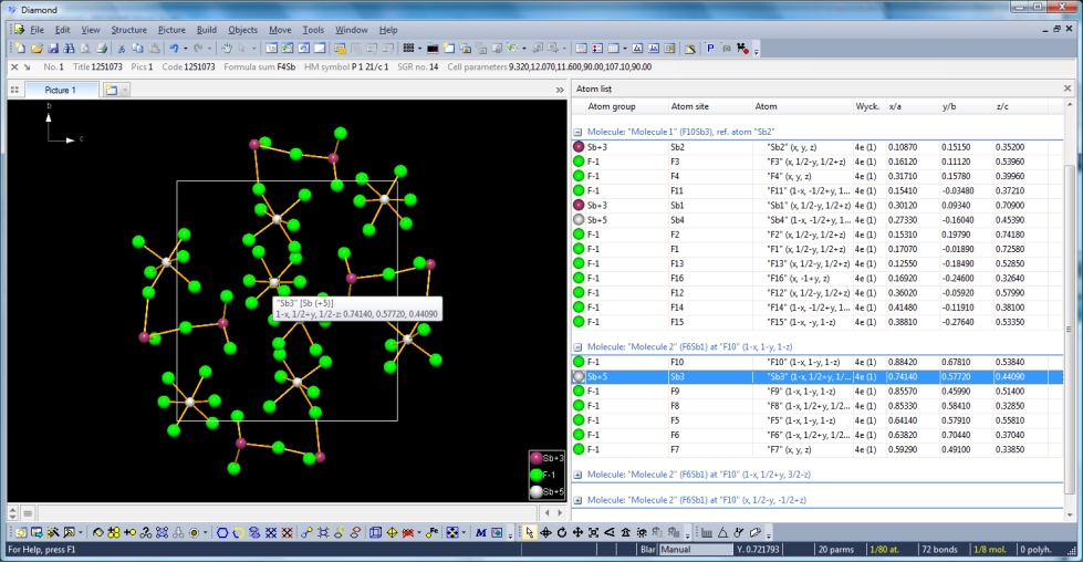 Previous article: "Atomic environment" as additional (optional) criterion when filling a coordination sphere or adding coordination polyhedra Open the sample file "PCD-1251073.diamdoc". This is a 1:1 adduct of antimony trifluoride and antimony pentafluoride containing two types of antimony, Sb+3 and Sb+5, in the atomic parameter list. The picture uses the bonding spheres derived from ionic radii, and the picture shows a packing diagram with two types of molecules: (To activate the atom list, run "Atom List" from the "View" menu, and in the atom list run "Arrange by molecules" in the context menu of the atom list.) Please note: The screenshots have been made with Diamond version 4, the functionality is the same in the current version 5.