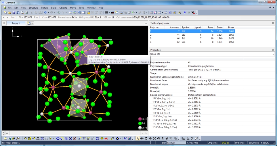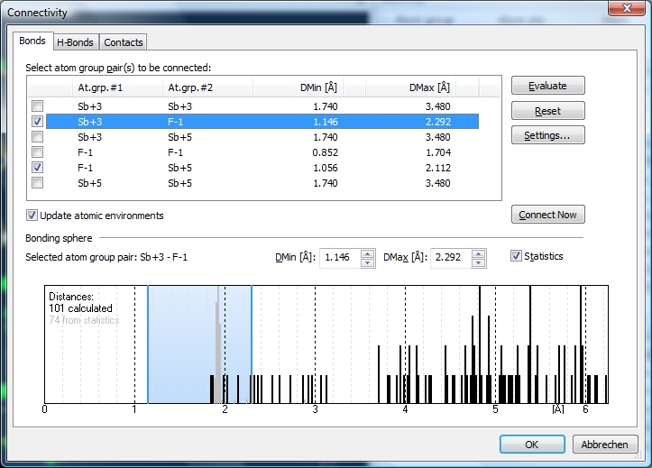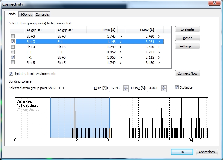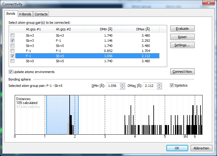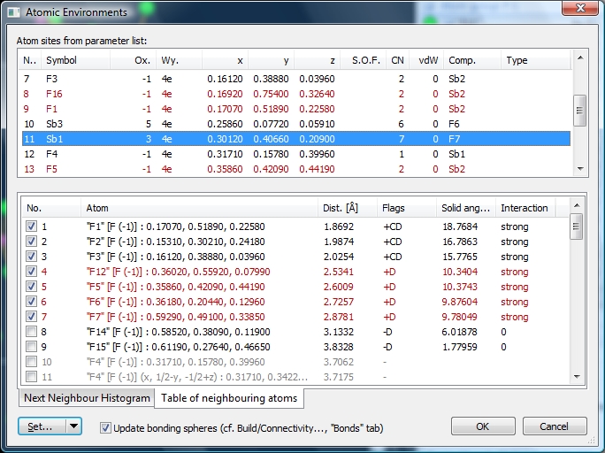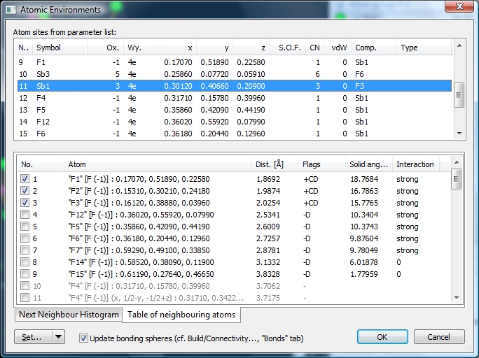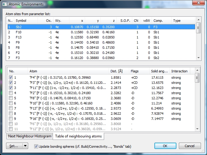 There are four Sb atoms in the atomic parameter list, two of them Sb+5 ("Sb3" and "Sb4"), and Sb+3 the two others ("Sb1" and "Sb2"). Let us check the bonding spheres on the "Bonds" page of the "Connectivity" dialog ("Build" menu). The distances histogram for Sb+5--F-1 has a sharp range of bonding distances and a wide and significant gap to the next spheres' distances ... ... whereas the histogram for the Sb+3--F-1 distances is not significant, and the upper bonding sphere boundary falls arbitrarily into a scattered sequence of Sb+3--F-1 distances. There is a gap at approximately 3.2 Angstroms. We also cross-check the atomic environments ("Build" -> "Atomic Environments"). When we mark the "Sb1" site in the upper list, the lower list shows the atoms in the environment. Atoms #1 through #9 are in black, and there are more in grey at positions #10 etc. Atoms #1 through #9 ("F1", ..., "F15") belong to the Dirichlet domain of the site "Sb1" (flag 'D'), the first three of them have been captured by the bonding sphere generation function (cf. "Connectivity") (flag 'C') and are thus marked as bonded (flag '+'). The remaining six F-1 atoms follow after a distance gap but only the first four of them have "strong" interaction. Some of the subsequent atoms ("F4") do not more belong to the Dirichlet domain, although they are closer to the center than "F15".