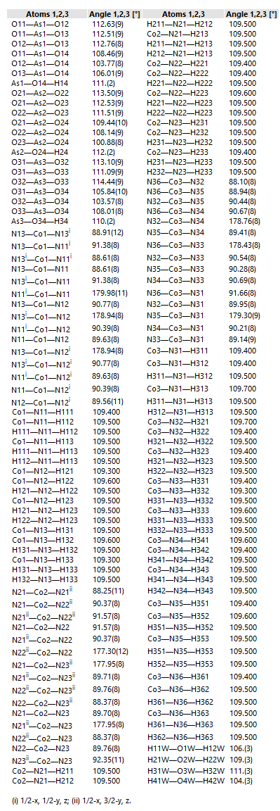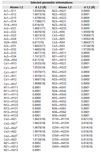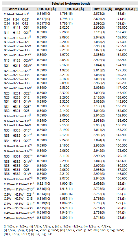 About reported distances, angles, and torsion anglesA Diamond document uses several lists for geometric informations about the current structure data set: Reported distances Reported angles Reported torsion angles Tables of reported distances, angles, and torsion angles The reported geometric informations can be listed in the data pane by the corresponding commands in the Table sub-menu of the View menu. Each row in the table comprises informations about the two, three, or four atoms involved and the distance and angle information. More details are available from the properties pane - usually below the table of reported geometric information. (See screenshot of table of reported distances above.) Distance, angle, and torsion angle informations in the data sheet The "comprehensive" configuration of the data sheet summarizes all informations available "reported" distance, angle, and torsion angle informations. The following is a screenshot of the data sheet of the sample document "COD-1500005-one-Co(NH3)6-molecule.diamdoc". The section "Selected geometric informations" lists the interatomic distances that have been imported from a list of "_geom_dist..." informations in a CIF file or have been created in Diamond by measuring distances or have been created by copying from the table of (calculated) distances. The list of distance informations is followed by a list of angle informations. About reported H-bond infos At this place, we also mention the Reported H-bond infos, which typically come from "geom_hbond..." loops in a CIF file. For historical reasons, these H-bond infos appear twice in a Diamond structure data set - once as the mentioned "reported H-bond infos" and second as "connection parameters". A "reported H-bond info" contains three distance (dD,H, dH,A, dD,A) and one angle (D,H,A) information about the three atoms donor, H-atom, and acceptor. The "comprehensive" configuration of the data sheet lists the "reported H-bond infos" in the section "Selected hydrogen bonds" (see below), whereas the H-bond connection parameters are listed in the "H-bond parameters" section.