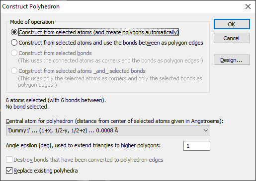 Previous article: Polyhedron construction from atoms and bonds You can find the sample files here: Open the file code-7106313-polygons.diamdoc. The picture "Two molecules" shows two molecules connected via the H-bond between O3-H3...O2 (1+x, 1/2-y, 1/2+z). Select the six C atoms in the top left phenyl ring (C10 through C15 at x, y, z each) and call the "Construct Polyhedron" dialog with the corresponding command in the "Build"/"Polyhedra" sub-menu: We also change the color of the polyhedron faces (here: the single hexagon) by pushing the "Design..." button to open the "Polyhedron Design" dialog.