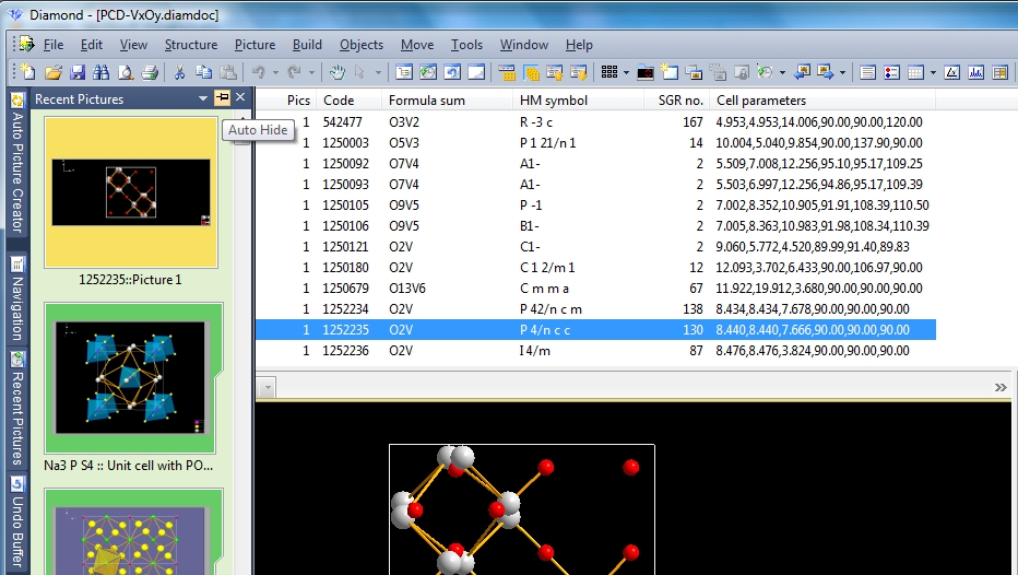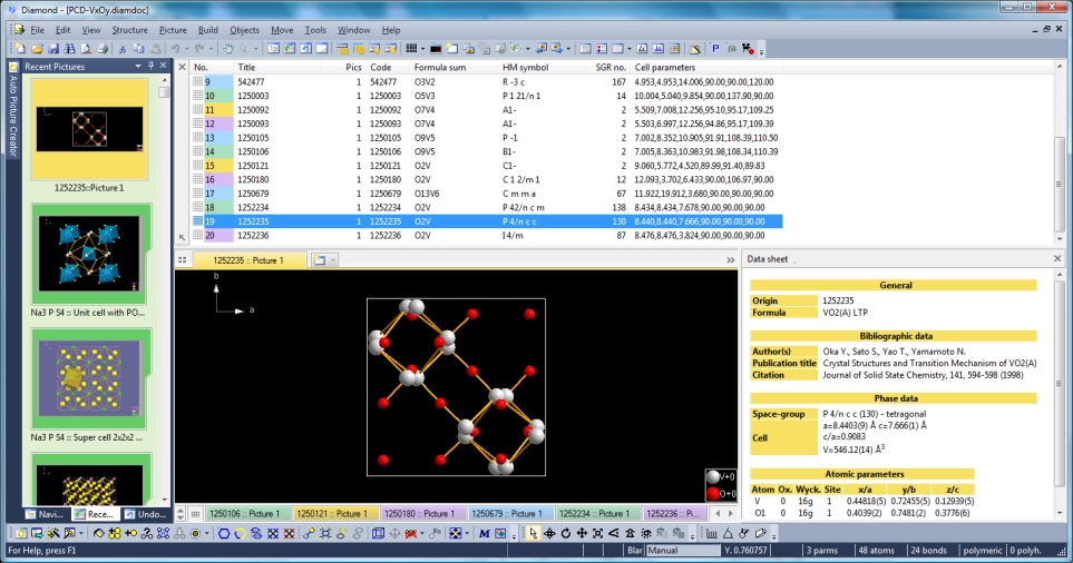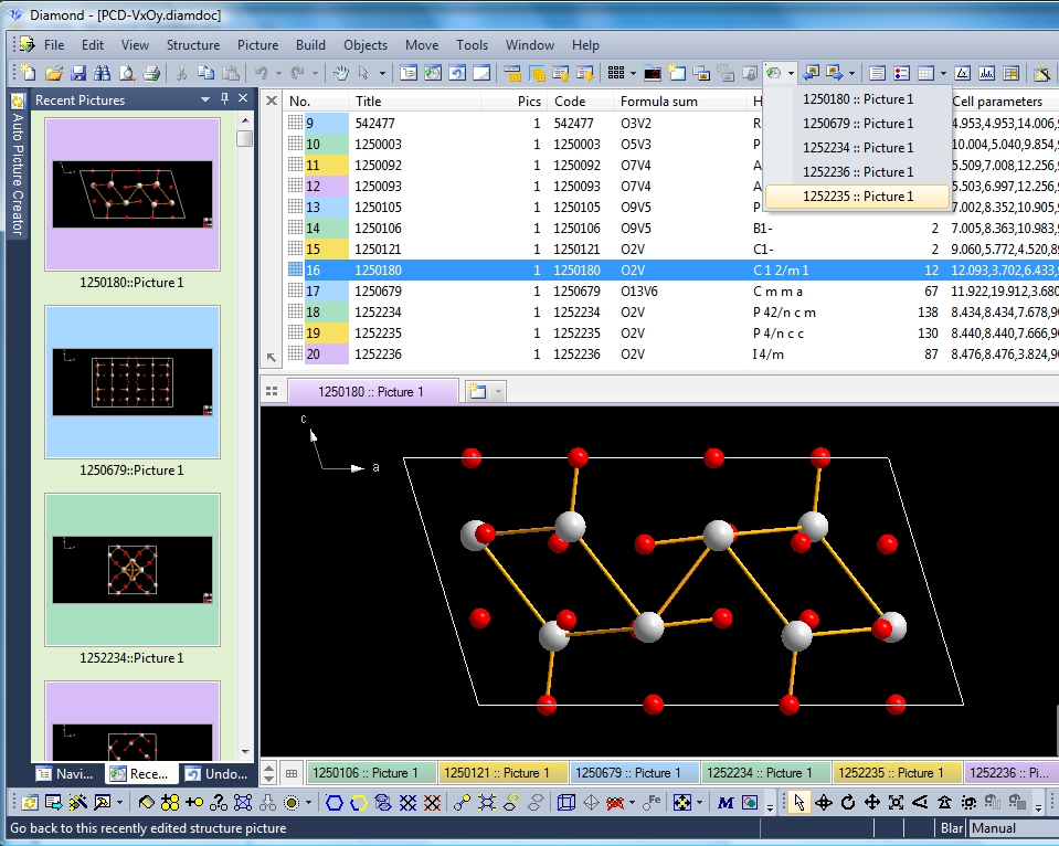 Previous article: Data Pane: Data sheet, tables, and atom list To demonstrate the "Recent Pictures" facilities, we open a sample file containing multiple pictures: "PCD-VxOy.diamdoc". This file was exported from an answer set in Pearson's Crystal Data (PCD) containing 20 binary V-O compounds and post-processed and saved with Diamond version 3.2. When we open that file -- and guess you have worked with file "Na3PS4-10-pictures.diamdoc" in a previous Diamond session, then the screen may look like this: Note: Screenshots are made with version 4 and using tabs. For tabs read the article "Side-by-side Structure Picture Editing".