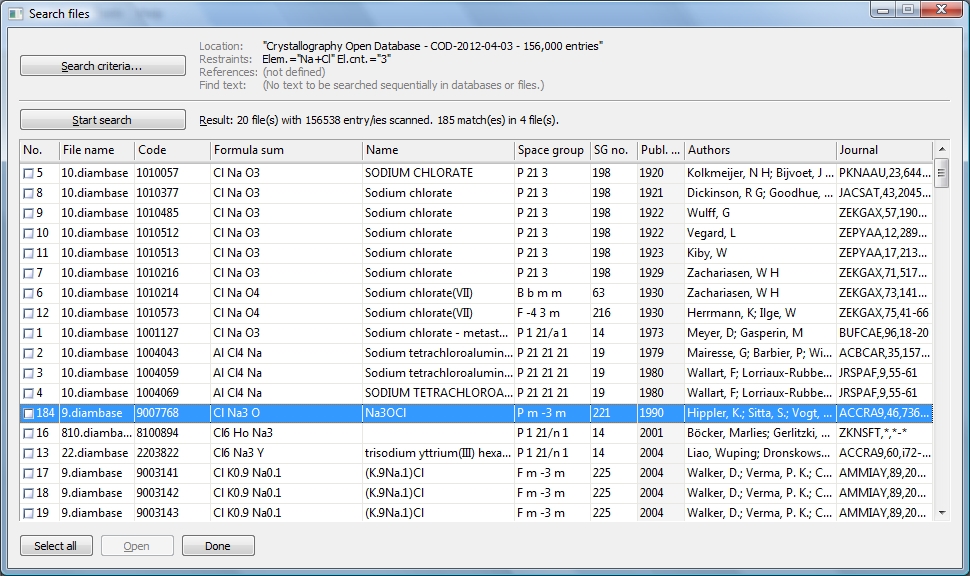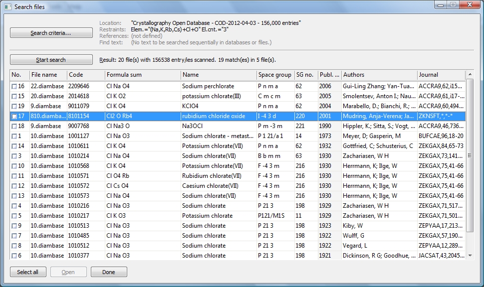 To search the COD for matching compounds, run the command Search from the File menu, which opens the Search Files dialog. This dialog window comes up with an empty list of matching COD entries when you run it the first time during a Diamond session.