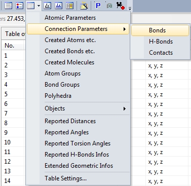 Tables for bond, H-bond, and contact parametersSince version 4 Diamond supports explicitely defined bonds (i.e. strong or "regular" bonds), H-bond definitions, as well as non-bonding contact definitions. These are the bond, H-bond, and contact parameters, rsp. Usually they come from "_geom_bond_xxx" etc. loops in CIF structure data files. In analogy to the atomic parameters, you can define/edit them through the command Connection Parameters in the Structure menu. More details are in the article "Connection parameters". Like for the atomic parameter list, the parameter list tables for bonds, H-bonds, and contacts can be shown through the sub-menu Table in the View menu, or simply through a drop-down menu from the main toolbar: