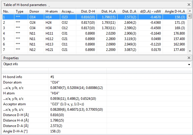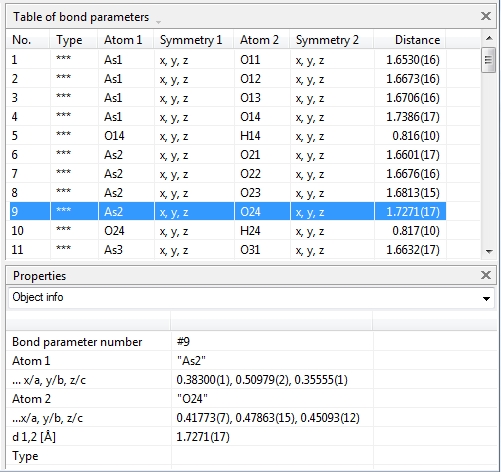 Cf. the article "About atoms, atom groups, bonds, and bond groups". The table of polyhedra lists all coordination polyhedra and Voronoi polyhedra currently present in the structure picture and is described in the article "Polyhedron selection and properties". The table of created molecules lists all molecules present in the current structure picture, if at least one of its constituent atoms is present in the structure picture. Given is the formula sum of molecule and fragment as well as the label and symmetry of the reference position. There are also tables for reported distances, angles, and torsion angles, which may come from measuring distances, angles, or torsion angles, rsp., as well as tables for H-bond infos (typically from imported CIF H-bond loops). These are described in the article "Measuring and reporting distances, angles, and torsion angles". The table of extended geometric infos is described in the article "Extended geometric infos: Angles between planes etc.". To open an object list, choose the Table command from the View menu, and select the corresponding entry from the submenu. If the data pane has not yet been opened, Diamond switches to split mode, where you can define the width of the object list. For each object list, you can select the columns to be displayed as well as the sort criterion. More informations about the object that is selected in the table can be shown in the "Properties view", which is by default placed below the table in the data pane. The object lists can be used as versatile aid to select atoms, bonds, or polyhedra in the structure picture.