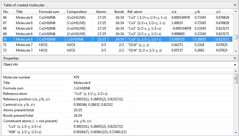 The properties pane shows more details about the highlighted molecule in the table, especially the list of constituent atoms and bonds with their crystal coordinates.