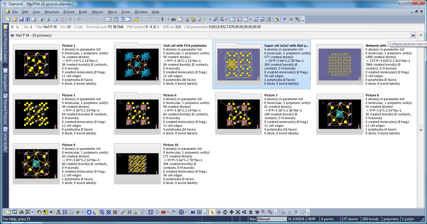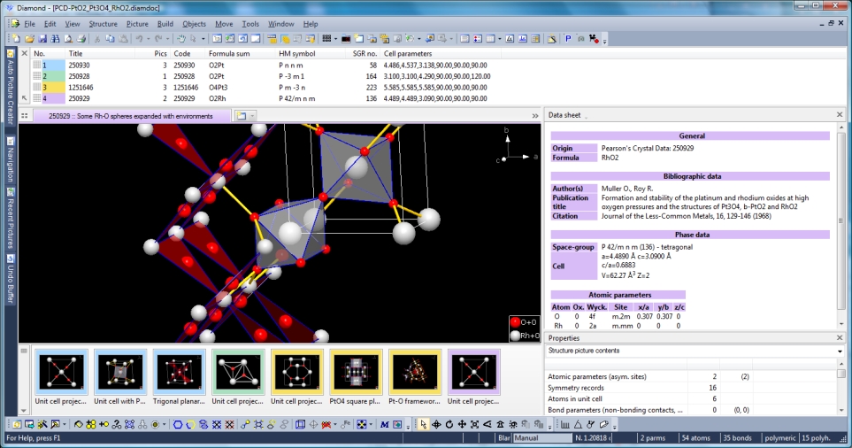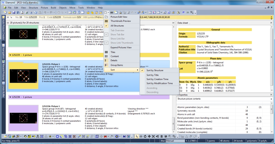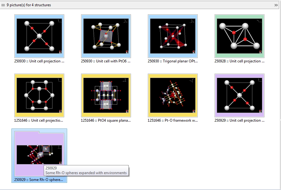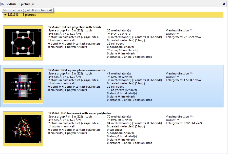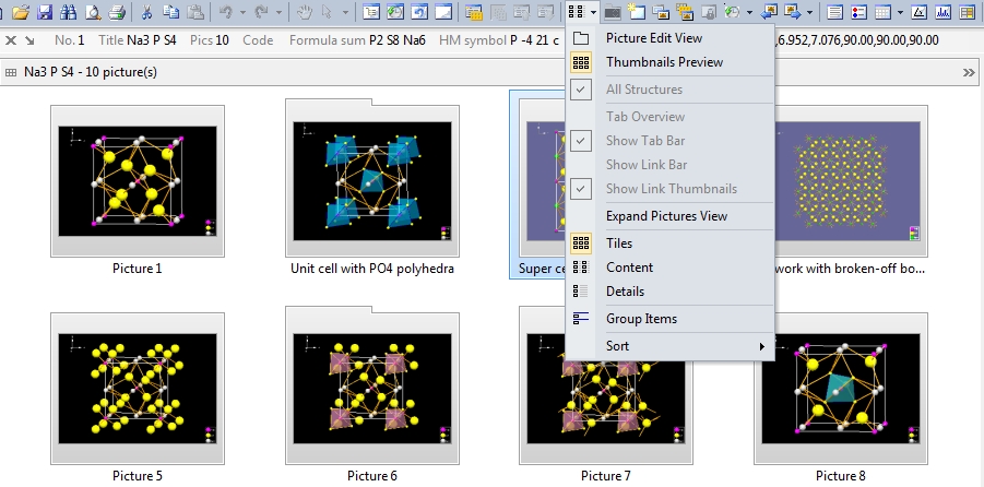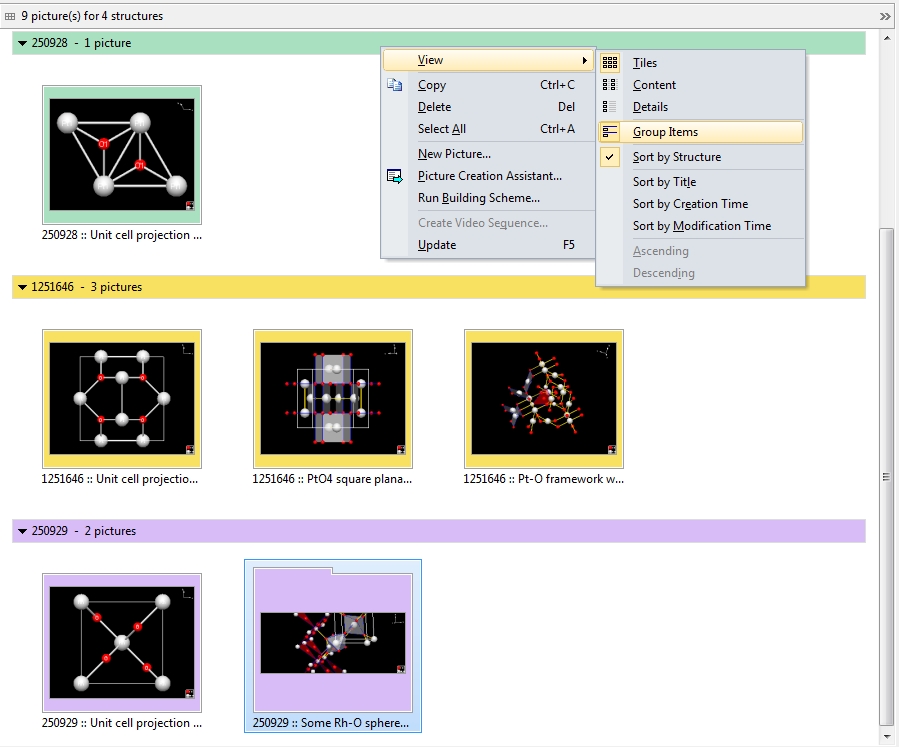Multiple pictures for multiple structures Changing to picture thumbnail view leads to an overview of nine tiles with the last one highlighted and having a tab on its thumbnail frame: Note: This "Tiles" sub-mode is the default. Maybe when you played before with Diamond, the last setting is pre-set, so you may see "Contents" or "Details". To switch to "Tiles", use the drop-down menu that is mentioned in this article above. Grouping of items (this time from the context menu of the pictures view, as shown in the screenshot), results in: If you want to see the pictures of one data set only, that means suppress the other data sets' pictures, you can choose the left-most symbol in the picture thumbnail view title bar, as highlighted in the following screenshot. There we also switched to structure "1251646" (Pt3O4), which has three pictures.