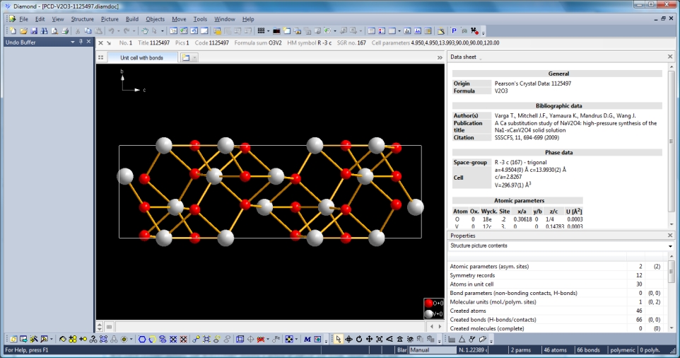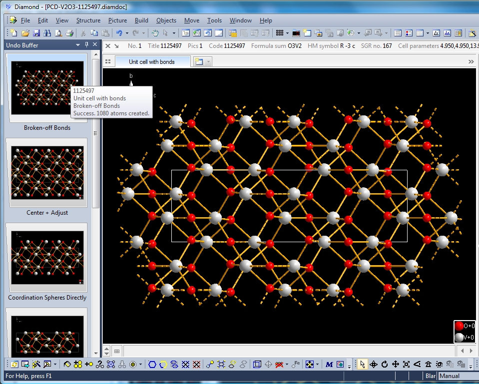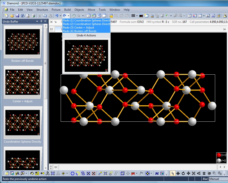 Previous article: Recent Pictures To demonstrate the enhancements in Undo and Redo, we open the sample document "PCD-V2O3-1125497.diamdoc", which shows up with picture "Unit cell with bonds" of data set #1125497 of Pearson's Crystal Data (PCD). We also open the docking window "Undo Buffer" using the command "Undo Buffer" from the "View" menu. (Maybe it is necessary to dock ("pin") the window at the left side of the Diamond application window, by pressing the pin symbol in the "Undo Buffer" docking window's title bar.)