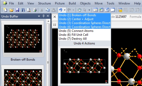symbol that you already know from Diamond version 3). The resulting Diamond window should now look like this:The "Undo Buffer" window contains thumbnails of the picture's conditions before the command execution each with the latest action on top. A tooltip window may offer you additional information, for instance how many (invisible) atoms were created in the last step of creating broken-off bonds. Alternatively, you can use a drop-down menu in the main toolbar (right beneath the "Undo" symbol), which opens a list of the last (here: seven) actions and a thumbnail of the condition you would restore when undoing the last N actions. After "undoing" the last four actions, we return to the state of the picture before the first filling of coordination spheres, and the "Undo Buffer" window now looks like this, and the four actions have moved into the redo buffer, whose drop-down menu we also opened in the following screenshot: Note: The shape of the frames in the Undo Buffer window looks different, the background is somewhat darker and the labels white rather than black to indicate that these steps are redo actions, not undo actions. The conventional way of making undo and redo stepwise - like in version 2, 3, and 4 of Diamond - is still available, too: Edit -> Undo or Ctrl+Z; Edit -> Redo or Ctrl+Y, rsp.