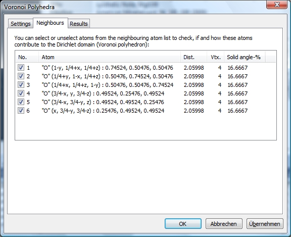 Again, like in the sample #1 (magnetite), we have the situation that not all atoms of the Voronoi polyhedron do contribute as (strongly connected) neighbouring atoms -- after evaluation of the overlap of spherical domains and Slater radii spheres.