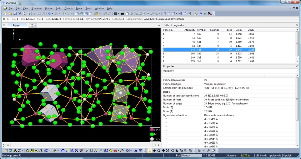 with the structure picture of COD-9013529.diamdoc: The first page of the "Voronoi Polyhedra" dialog shows a list of all atom sites, which you can use to choose the atoms in the structure picture to become center(s) of Voronoi polyhedron/a. Or you choose "Selected atoms in structure picture", provided at least one atom in the structure picture has been selected before calling the dialog. The middle part of the dialog page refers to the polyhedron shape and is similar to the shape and design of (conventional) coordination polyhedra that you already know from older Diamond versions. In the section concerning the atoms in the neighbourhood you define if and how far to create neighbouring atoms (that means all or certain atoms of the Dirichlet domain) and if and how to connect the central atom with the neighbouring atoms. The second page shows the list of neighbouring atoms for the site that is selected or checked in the atom site list of the first page or (has been selected in the structure picture). Here the Dirichlet domain looks straightforward simple, six equidistant Fe--O distances of 2.06 Angstroms, leading to a regular cube with four vertices for the six faces each and a solid angle of 1/6 (or 16 2/3 percent). Confirming the dialog with OK for the (selected) single "FeM" (central) atom, leads to the following Voronoi polyhedron picture. (To show the table of polyhedra, use the corresponding command from the "View" menu, "Table" sub-menu. Choose the option "Dirichlet domain (Voronoi polyhedron)" in the Properties view and adjust the column widths in the properties view.) The Voronoi polyhedron is the expected cube, formed by the intersecting planes of the atomic environment, which forms a regular octahedron. Repeating this procedure for the other two sites "FeT" and O show that these domains/environments are somewhat complicated. The Dirichlet domain of "FeT" is not the tetrahedron -- we might expect -- but has 20 neighbouring atoms, four near O atoms 1.887 Angstroms away from the center, and followed by twelve more O atoms after a big distance gap at 3.494 Angstroms and four "FeT" atoms at 3.636 Angstroms each. The Voronoi polyhedron has 36 vertices and 156 faces: And finally the situation for the O site. Here we also have a lot of neighbouring atoms (19) and a big distance gap after the four Fe neighbours, one "FeT" 1.887 and three "FeM" 2.060 Angstroms away from the center. A series of twelve O-O distances between 2.856 and 3.082 Angstroms follows, most of the O neighbours are "indirect neighbours" (meaning that the centerpoint of the vector center--neighbour lies out of the Voronoi polyhedron's surface). This is indicated by the asterisk before the sequential neighbour number in the list of neighbours in the properties view. Finally there are three "FeT" neighbours 3.494 Angstroms away. The Voronoi polyhedron has 34 vertices and 53 faces: In summary, only for the "FeM" site all atoms of the Voronoi polyhedron (Dirichlet domain) do contribute to the atomic environment, whereas for "FeT" and "O" it is only a fraction (four of 20 or 19, rsp.) of the neighbouring atoms. The reason is that for the evaluation of the contributing (that means bonding) neighbouring atoms considers if and how far the "spherical domains" of the Voronoi polyhedra overlap. The "spherical domain" is a sphere having the same volume as the Voronoi polyhedron, and Rsd is this sphere's radius. The evaluation also considers the element-specific "Slater radii" (Rs) -- empirically defined by J. C. Slater (1964). Sample #2: antimony trifluoride/pentafluoride adduct