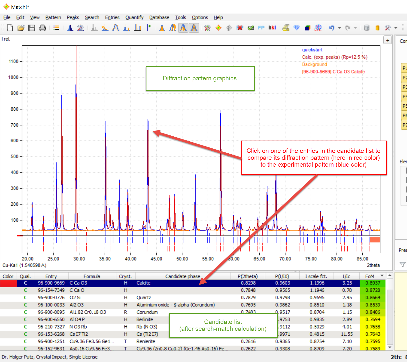If the peak data of a match list entry result from a pattern decomposition calculation, this is indicated by a "[PD]" in the legend of the pattern graphics.