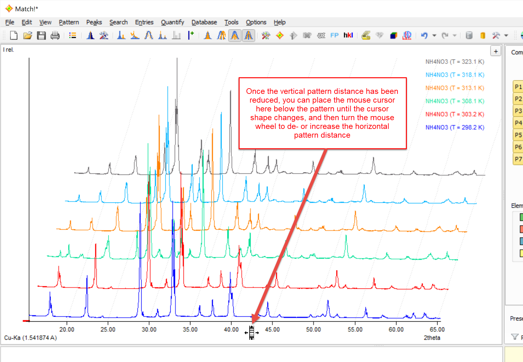 In order to increase the horizontal distance between multiple experimental patterns in the graphics, place the mouse cursor in the space below the diffraction pattern until the mouse cursor changes to , then turn the mouse wheel up or down in order to decrease or increase the vertical distance between the experimental diffraction patterns. As an alternative, you can increase or decrease the pattern distance using the <Ctrl+'+'> or <Ctrl+'-'> shortkeys.
