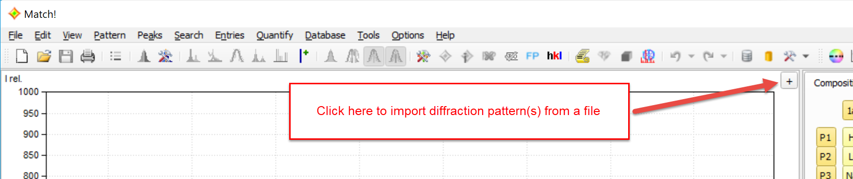 The diffraction pattern provides a graphical view of the powder diffraction data of the unknown sample (by default in blue color). You can click on the small '+' button in the top-right corner to import diffraction data from one (or more) file(s):