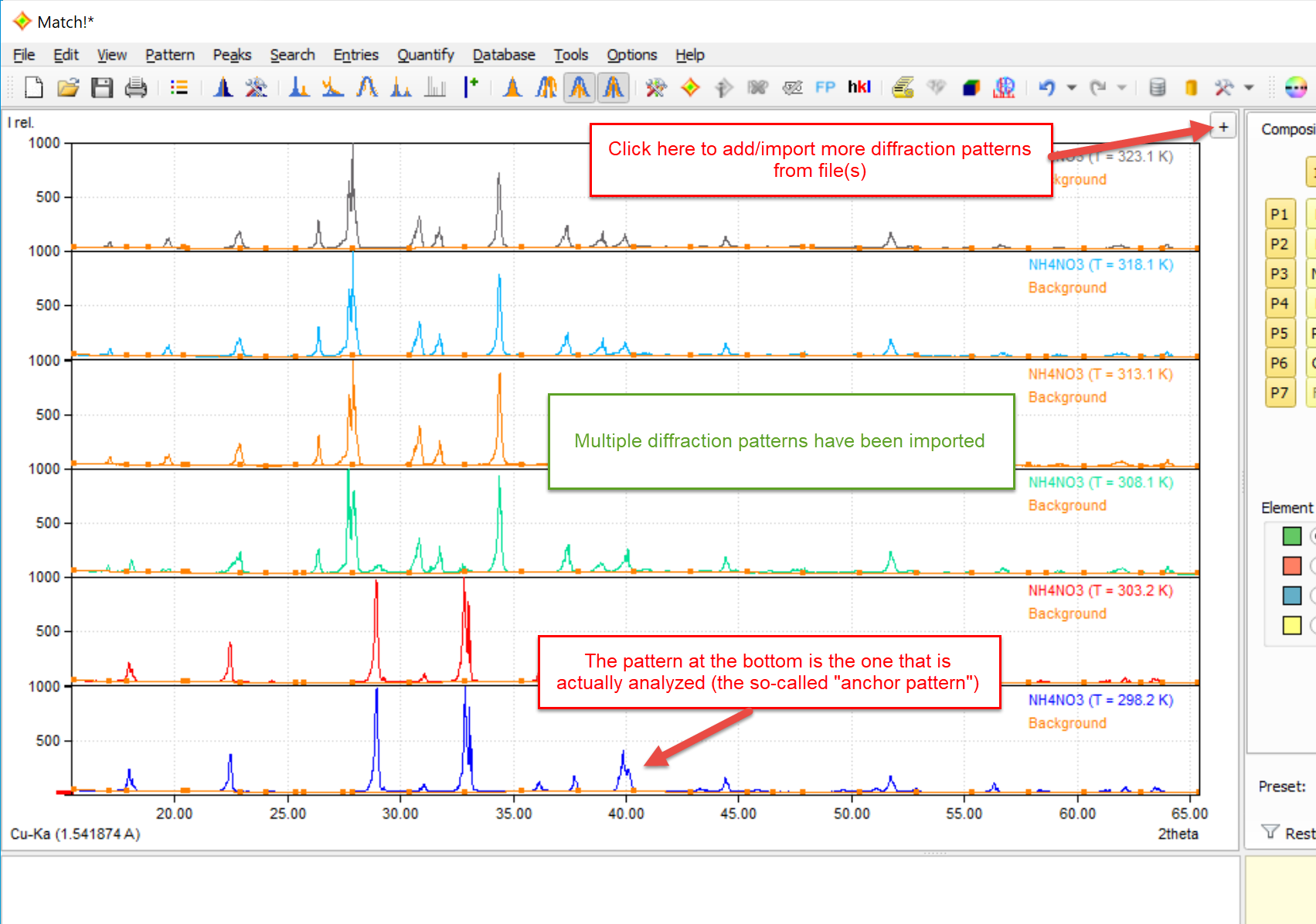 Once two or more diffraction patterns are present, they are by default displayed on top of each other in the pattern graphics area. The bottom-most pattern (the so-called "anchor pattern") is the one that is actually analyzed, i.e. the one to which the contents of the candidate and especially the match list at the bottom refer to.