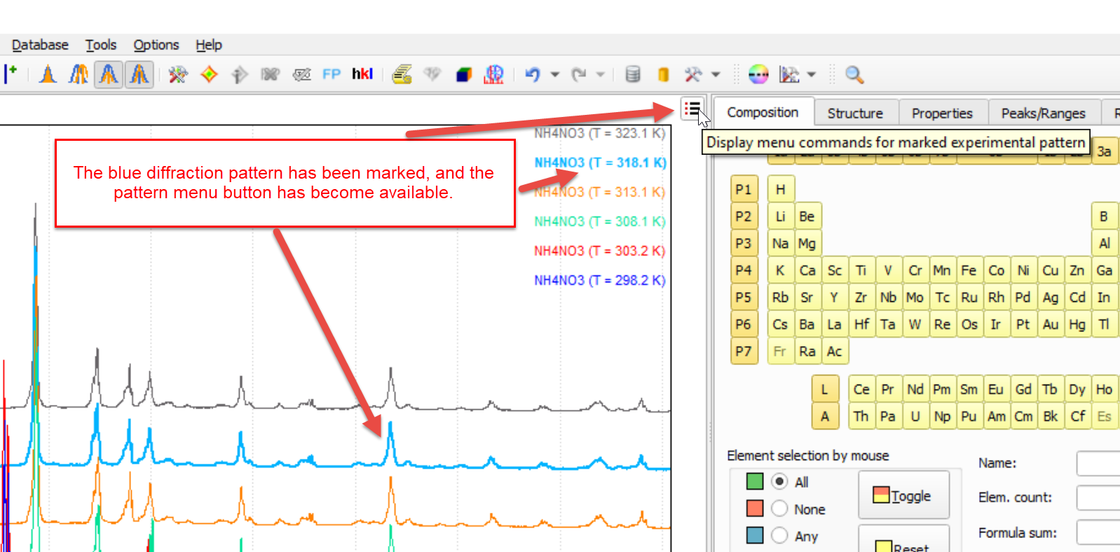 If you mark an experimental pattern in the graphics (e.g. by clicking on the profile curve or legend entry), it is displayed in bold, and the so-called pattern menu button becomes available in the upper-right corner (instead of the normal '+' button for importing diffraction data).