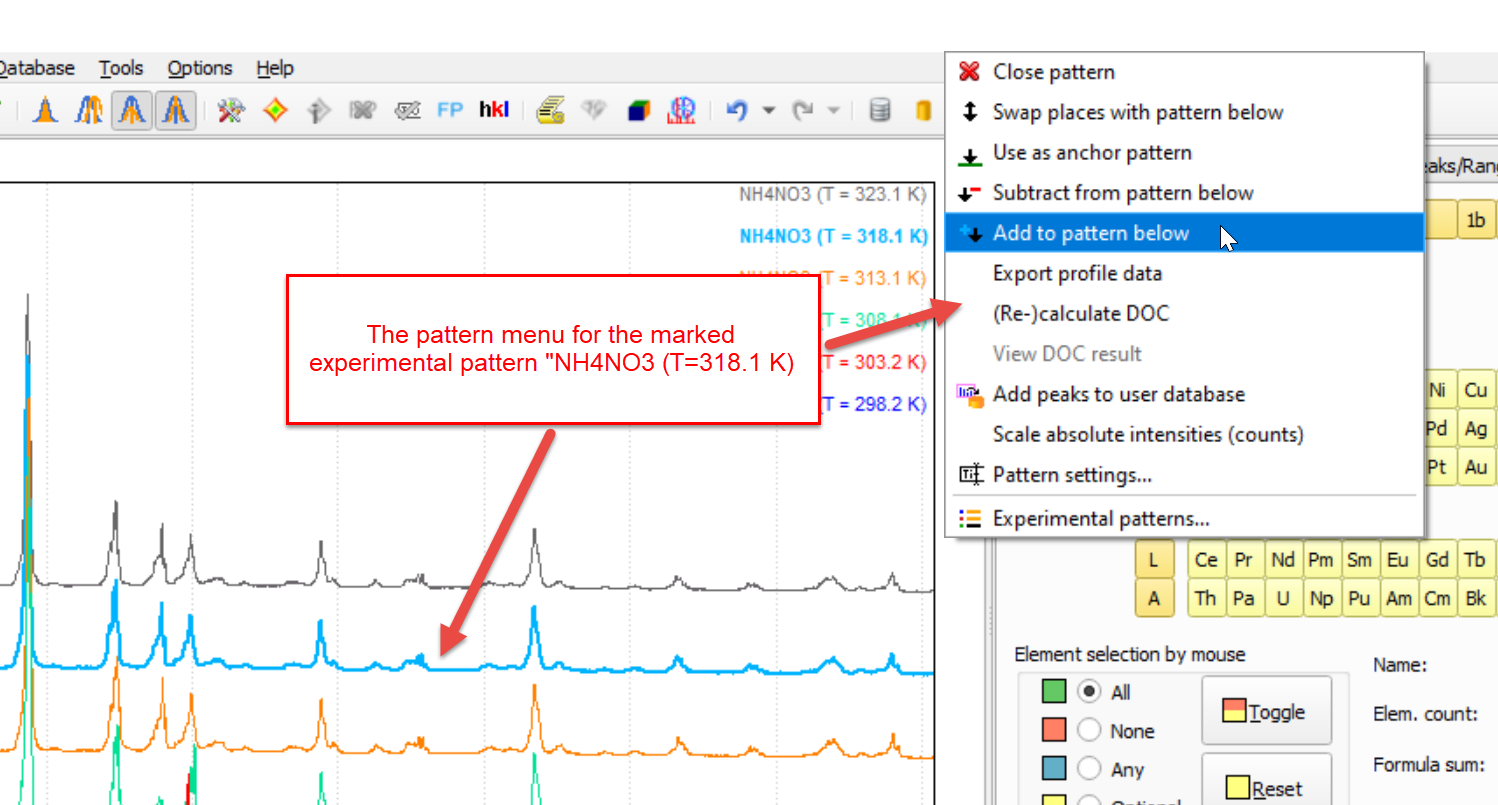In the pattern menu, the most-common commands for experimental patterns are available. You can e.g. exchange (swap) patterns, close (remove) an additional pattern, (re-)calculate the degree-of-crystallinity (DOC), change the Pattern settings (e.g. color, sample ID etc.), and finally also open the Experimental patterns-dialog that provides access to all experimental patterns that are currently loaded.