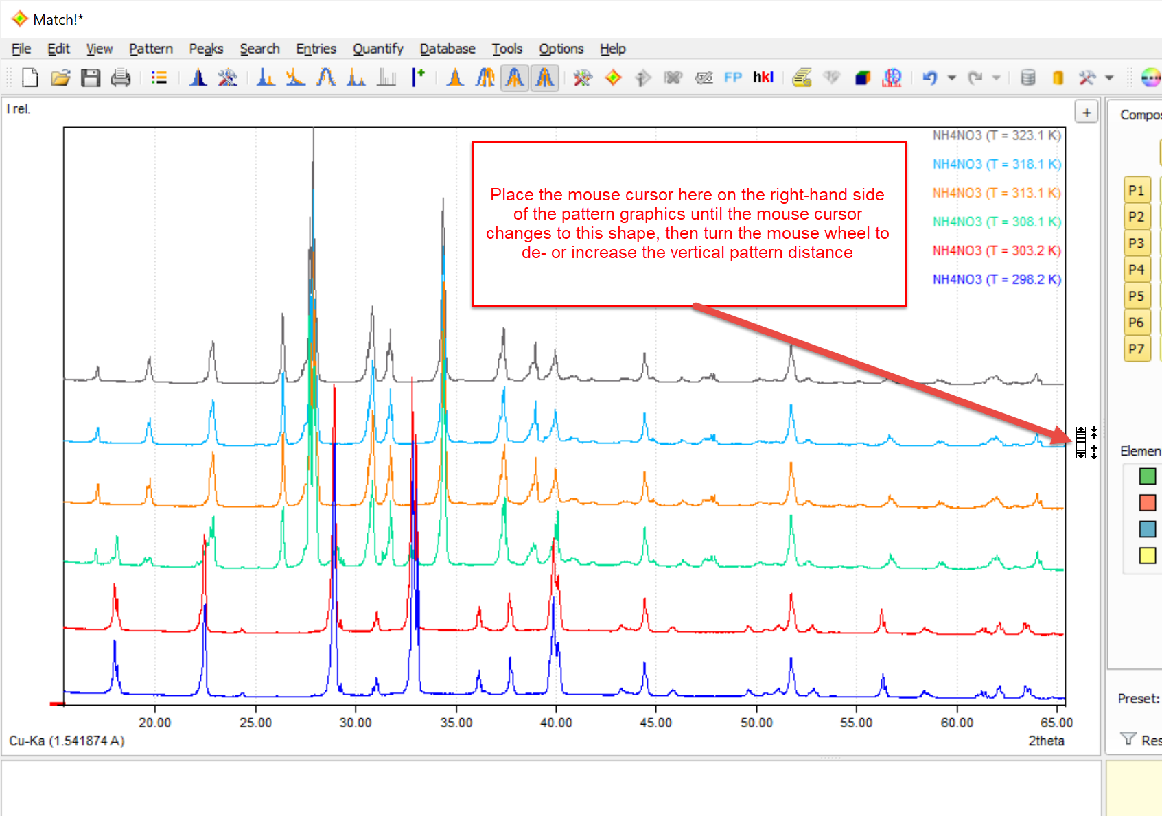 In order to decrease the vertical distance between multiple experimental patterns in the graphics, place the mouse cursor to the right of the diffraction pattern until the mouse cursor changes to , then turn the mouse wheel up or down in order to decrease or increase the vertical distance between the experimental diffraction patterns. As an alternative, you can increase or decrease the pattern distance using the <Ctrl+'+'> or <Ctrl+'-'> keyboard shortcuts.